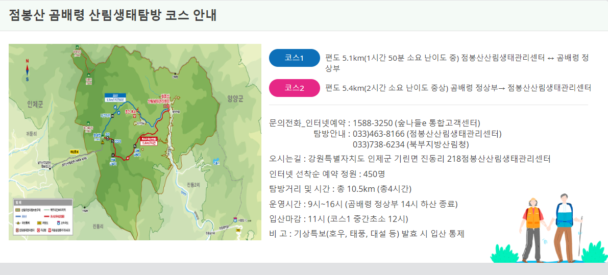 숲을 보호하기 위해 1년 중 8개월만 출입이 허용되고 일주일에 단 5일, 하루에 450명만 입산을 할 수 있습니다. 따라서 곰배령에 방문을 하려면 꼭 예약을 해야 합니다.
