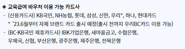 ● 카드사별로 사용처에 일부 차이가 발생할 수도 있으니 자세한 사항은 바우처 이용 카드사로 문의하는것이 좋습니다.