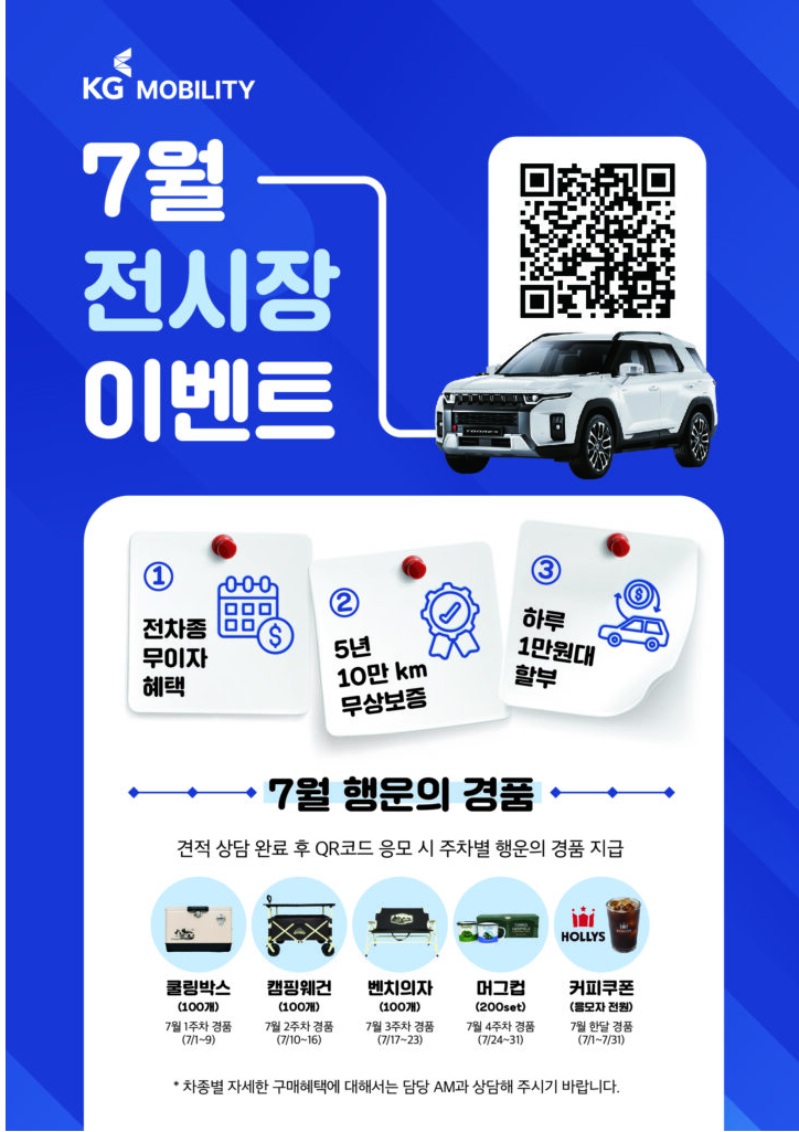 KG 모빌리티 매장에 방문해서 시원한 에어컨안에서 상담만 받아도 경품을 받을 수 있는 이벤트에 참여해 보세요.